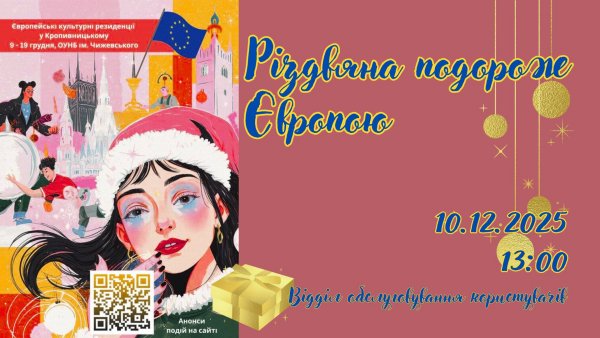 Ця гра-мандрівка є частиною різдвяного фестивалю «Європейські культурні резиденції у Кропивницькому», який проходить в бібліотеці Чижевського у рамках проєкту «Культурна та публічна дипломатія ЄС в Україні» за підтримки Представництва Європейського Союзу в Україні. На вас чекають інтерактивні завдання та ігри, майстер-клас, море позитиву та нових вражень.